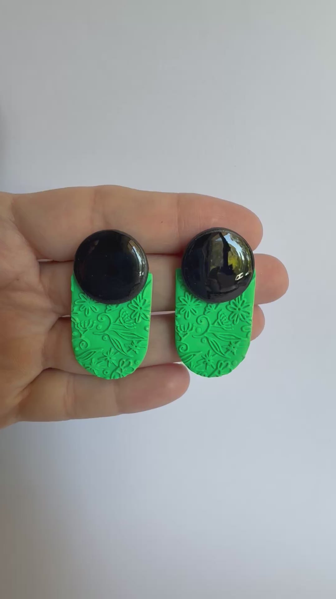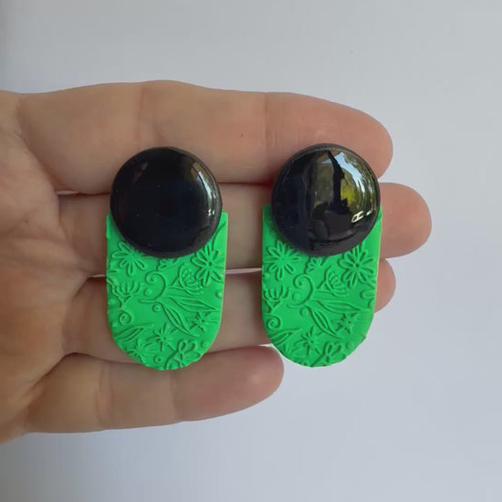 These earrings are medium sized with stainless steel silver posts. They are made from lightweight polymer clay with a matte floral imprint finish coupled with a durable resin finish on the stud to really make the black POP!