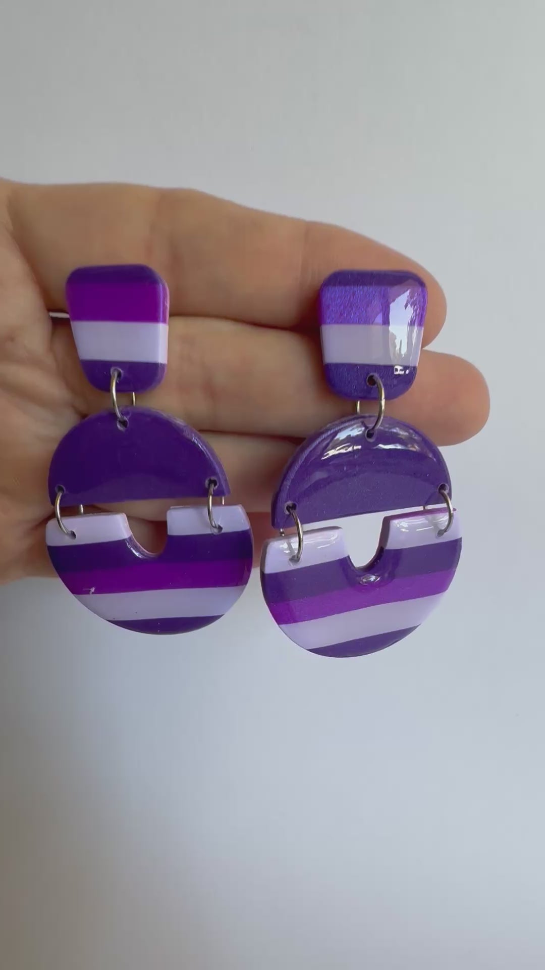 These dangles are made from lightweight polymer clay. They have stainless steel silver posts and silver findings, and a durable resin finish to really make the purples POP!