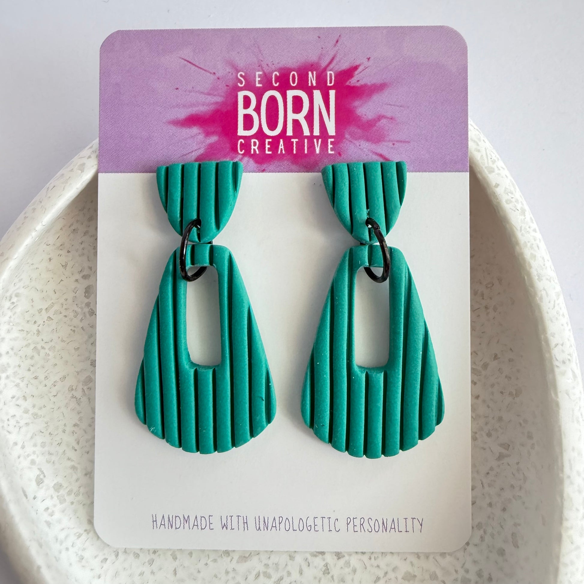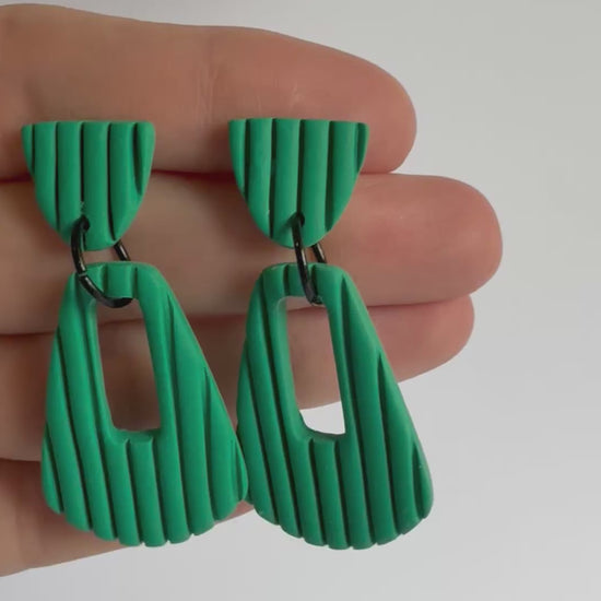 These earrings are medium sized with stainless steel posts and black findings. They are made from lightweight polymer clay in a matte, textured finish.