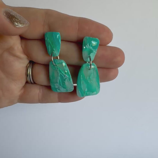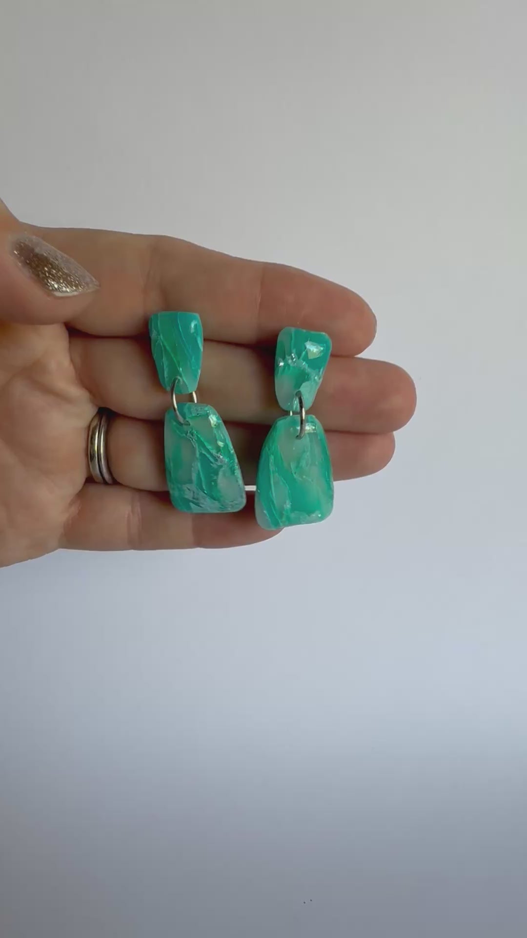 These earrings are medium sized with silver posts and findings. They are made from lightweight polymer clay with a durable resin finish to make the silver streak and vibrant colours POP!
