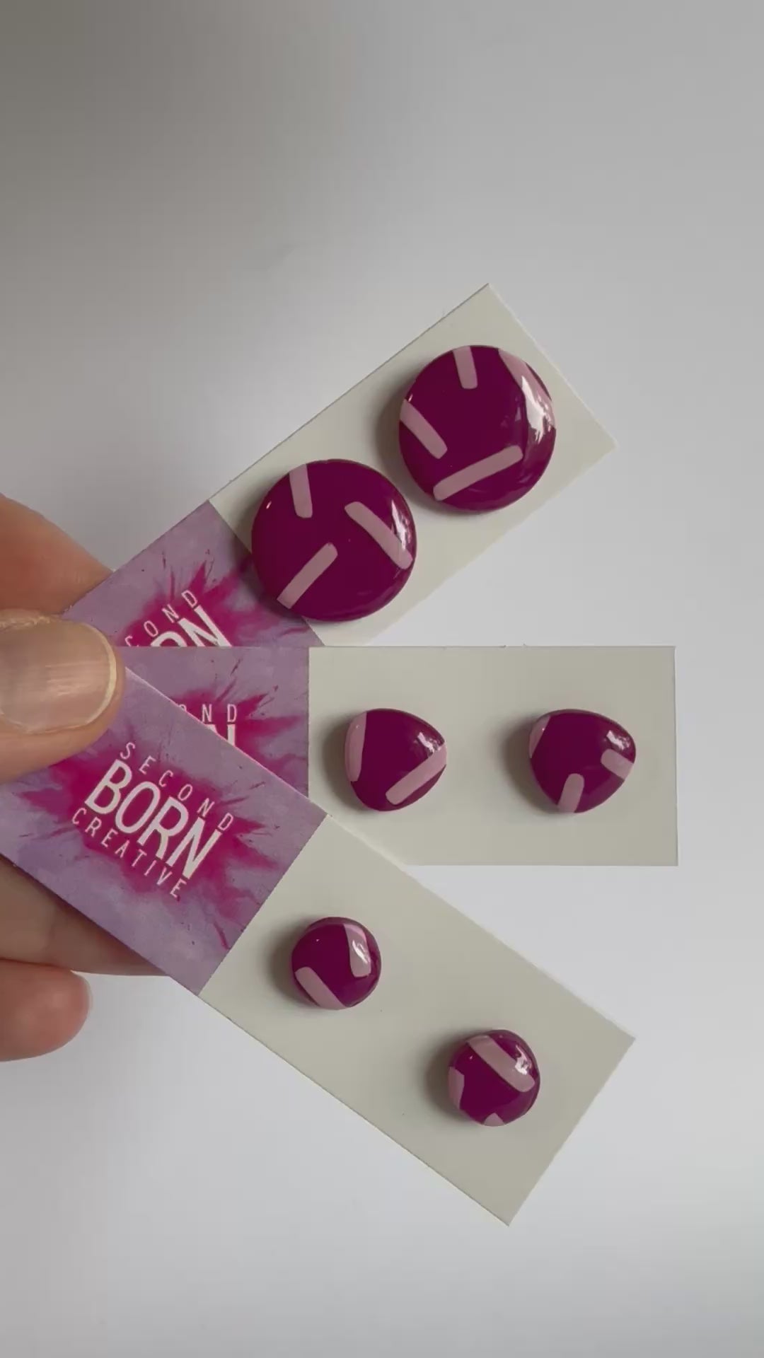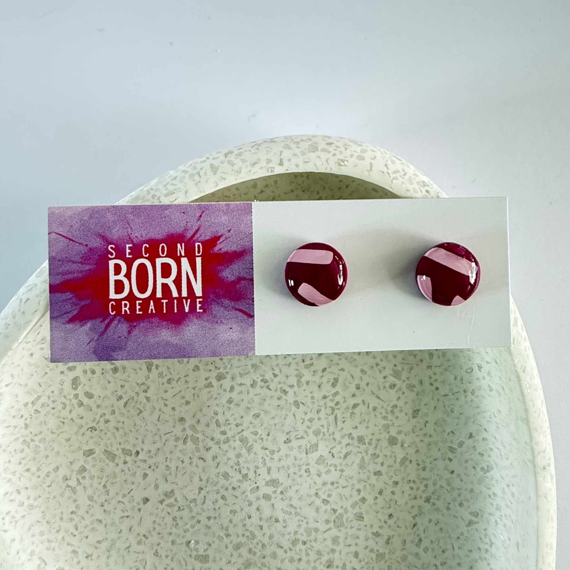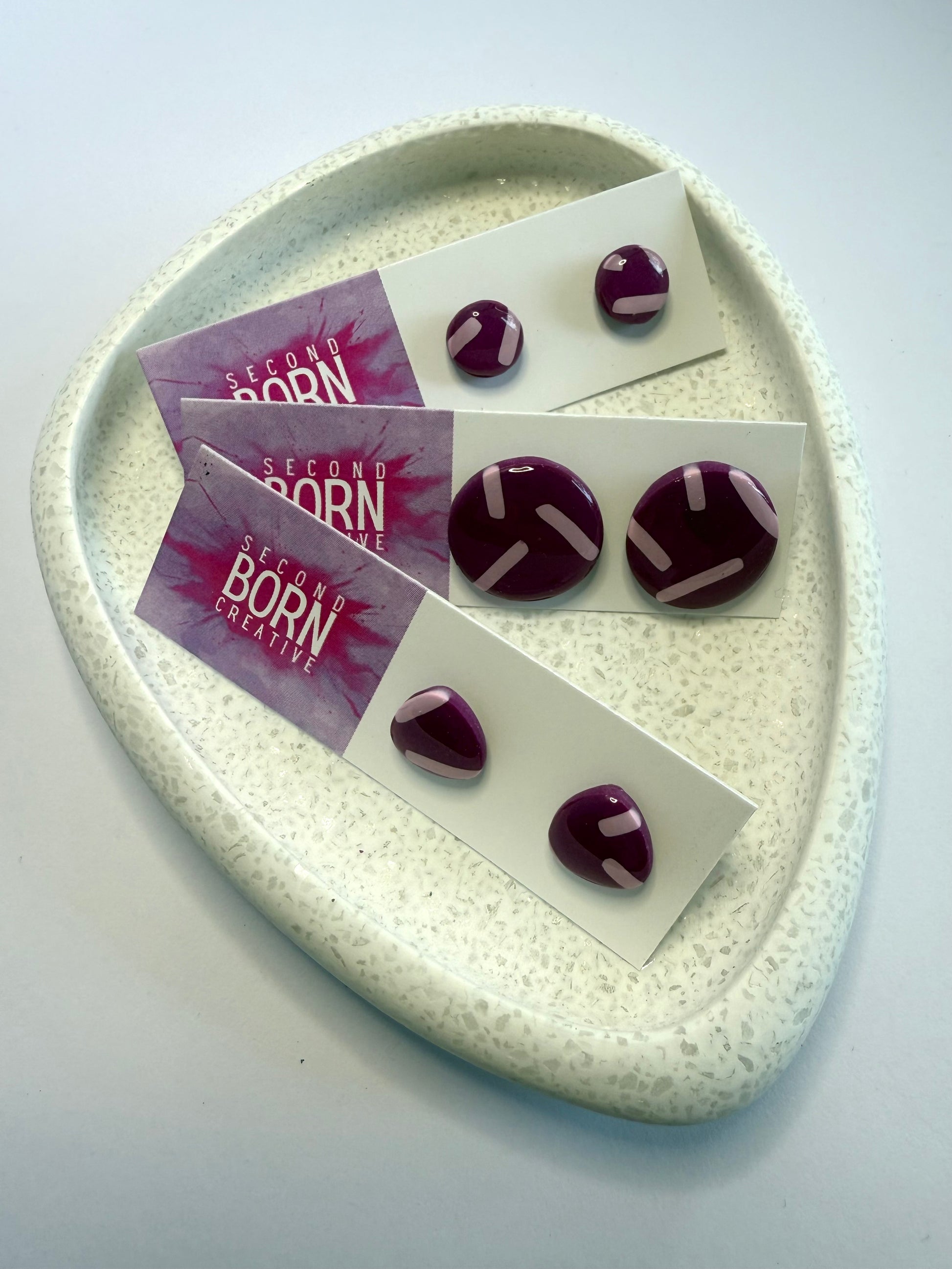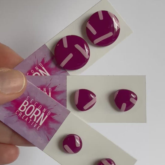 These earrings are made from lightweight polymer clay, stainless steel posts and a durable resin finish to make the vibrant colours POP! Available in a circle or rounded triangle.