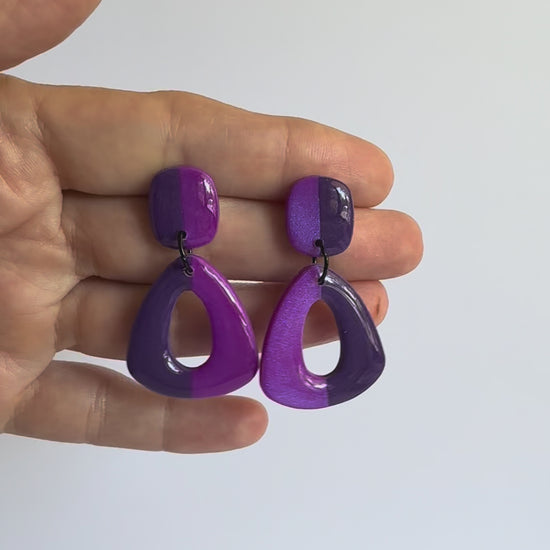 These earrings are medium sized with stainless steel silver posts and black findings. They are made from lightweight polymer clay with a durable resin finish to really make the dazzling purples POP!