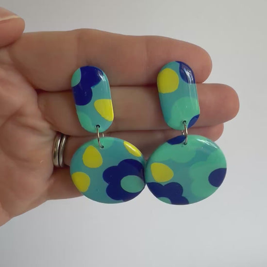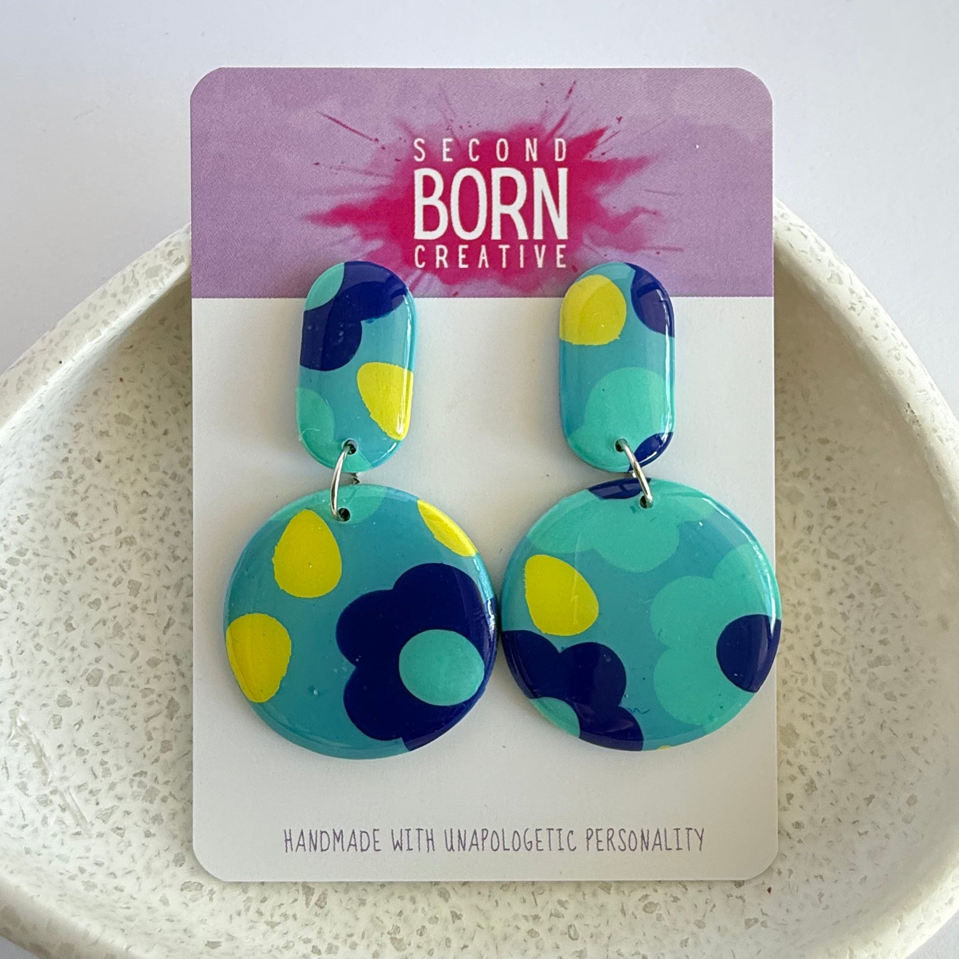 These earrings are medium sized with stainless steel posts and silver findings. They are made from lightweight polymer clay with a durable resin finish to make the vibrant colours POP!