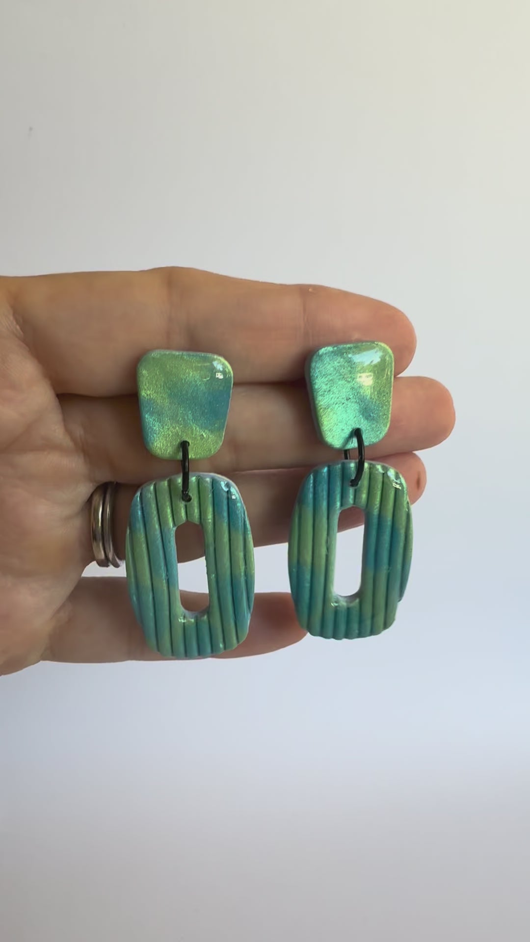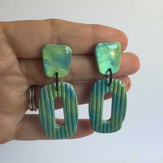 These dangles are made from lightweight polymer clay with shimmery mica powder detail. They have stainless steel silver posts and black findings, and a durable resin finish to really make the colours POP!