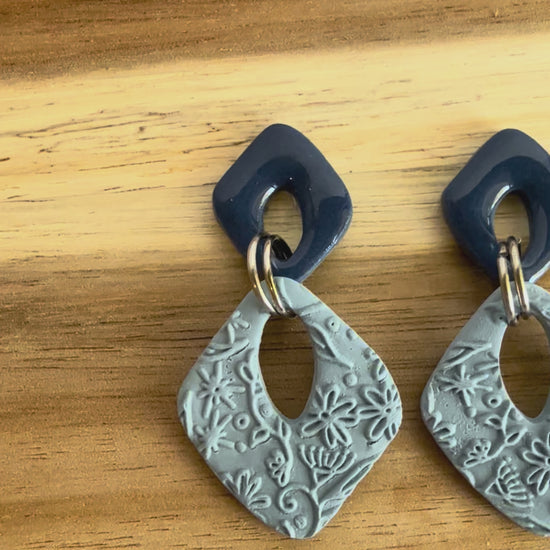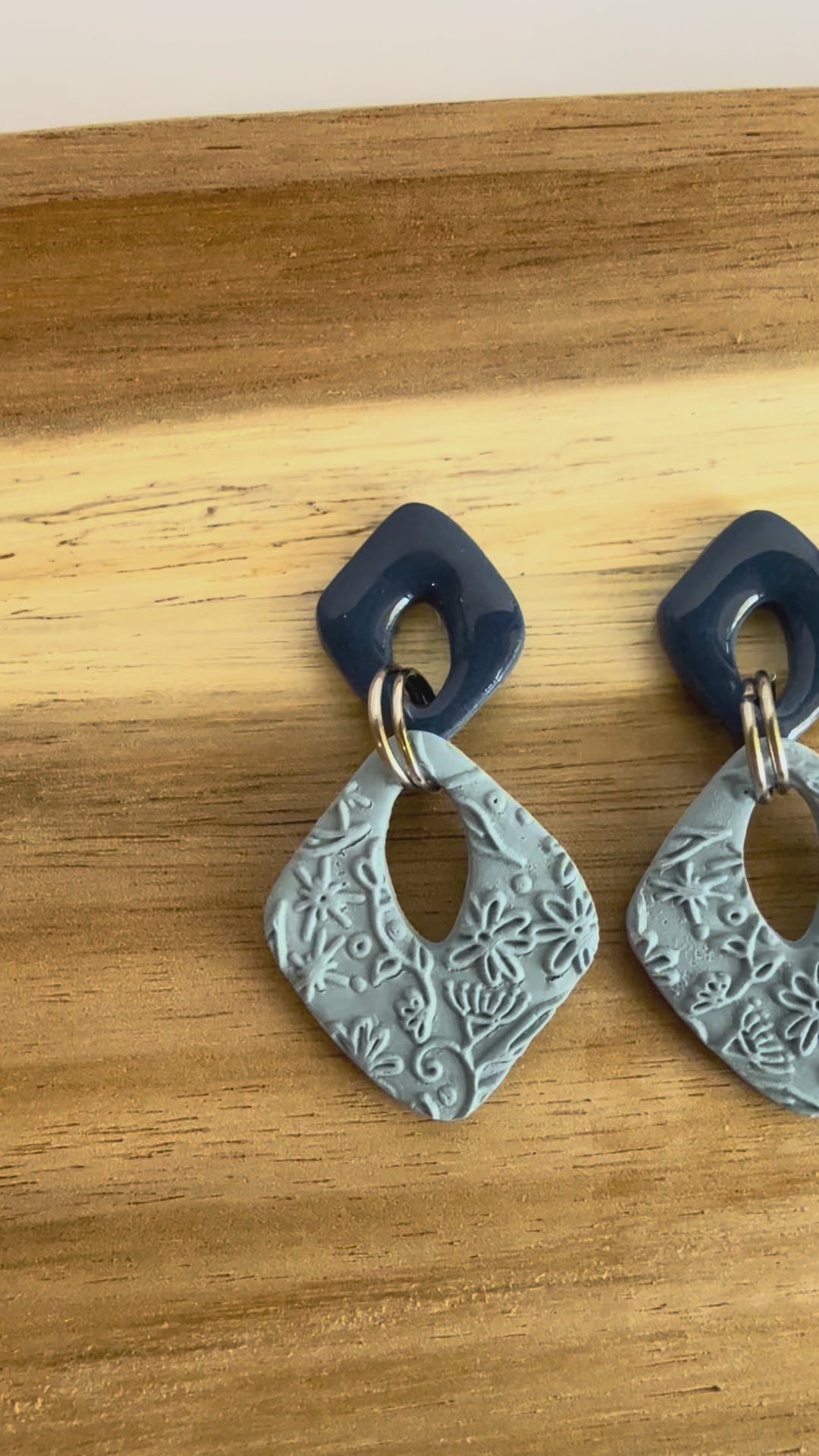 These dangles are made from lightweight polymer clay with stainless steel silver posts and silver findings. The floral imprint has a matte finish, while the stud has a durable resin finish to really make the blue POP!