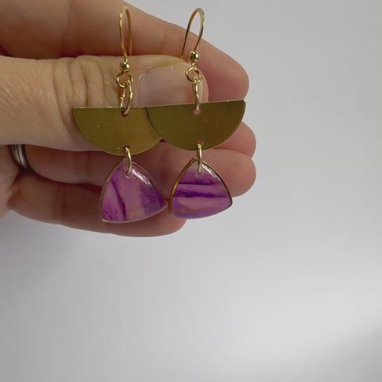 These earrings are medium sized with stainless steel hooks and gold findings. They are made from lightweight polymer clay with a durable resin finish to make the vibrant colours and shimmery gold POP! Plus a bold gold semi circle accent, and gold bezel to really make them stand out!