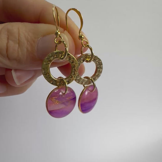 These earrings are large sized with stainless steel hooks and gold findings. They are made from lightweight polymer clay with a durable resin finish to make the vibrant colours and shimmery gold POP! Plus a gorgeous hammered gold accent circle and embed to really finish it off!