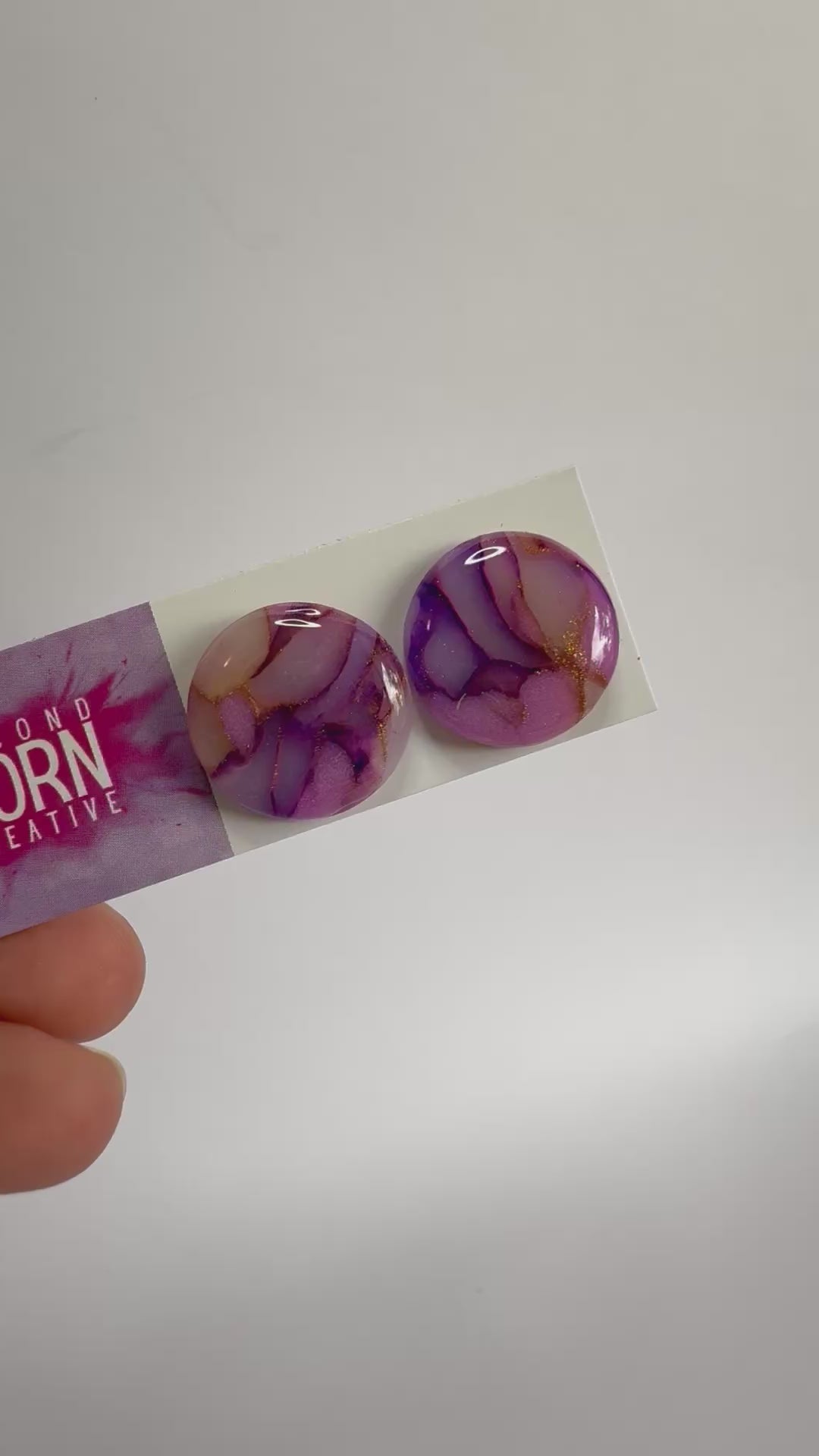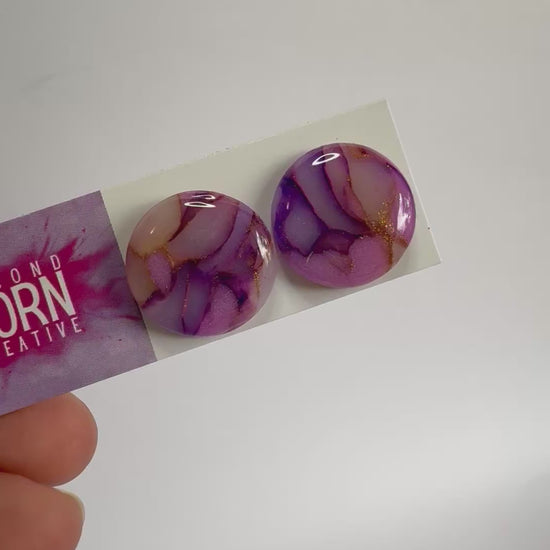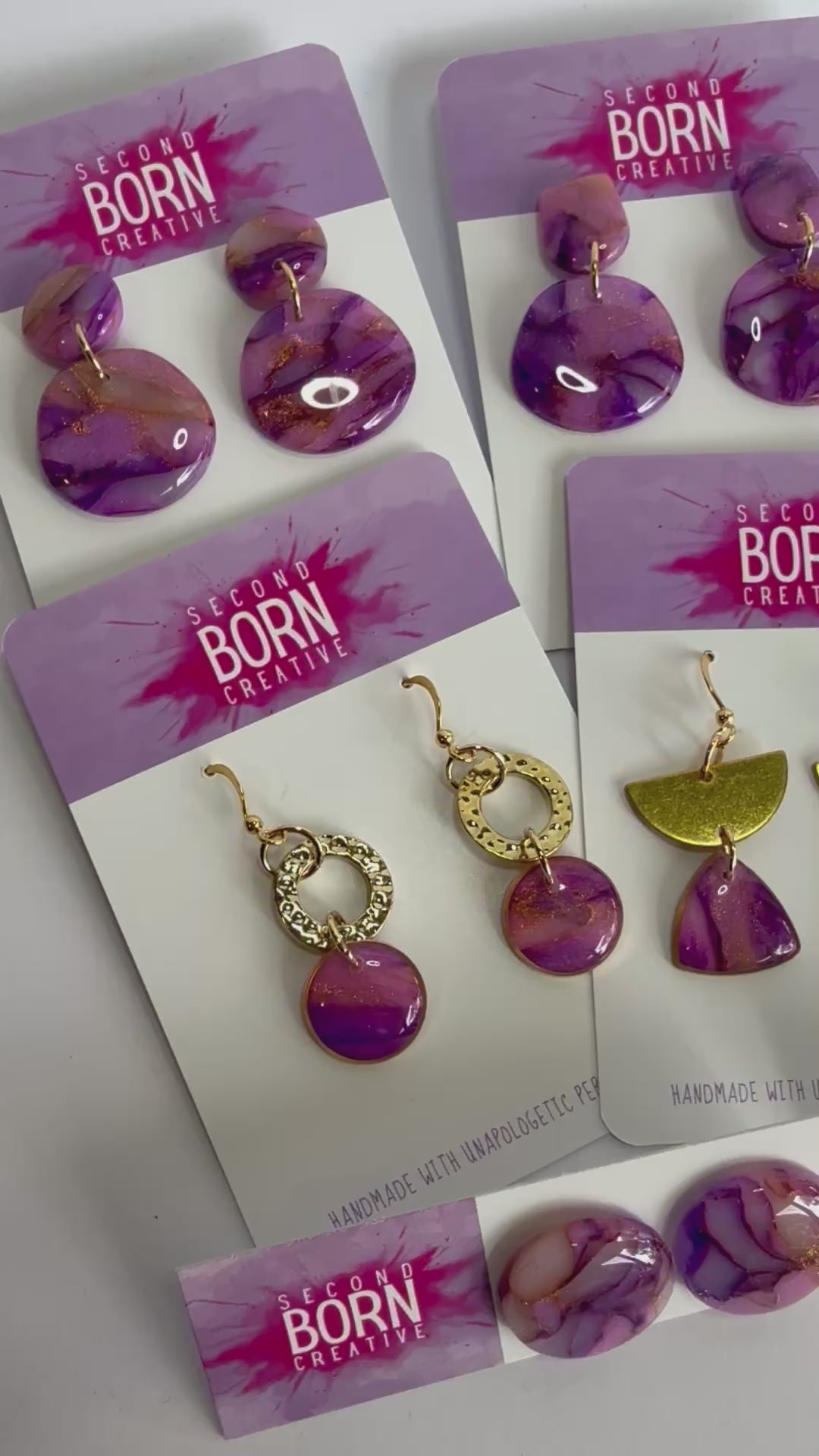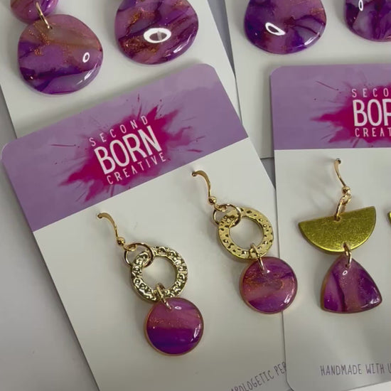 These earrings are made from lightweight polymer clay, gold stainless steel posts and a durable resin finish to make the vibrant purples and gold shimmer POP!