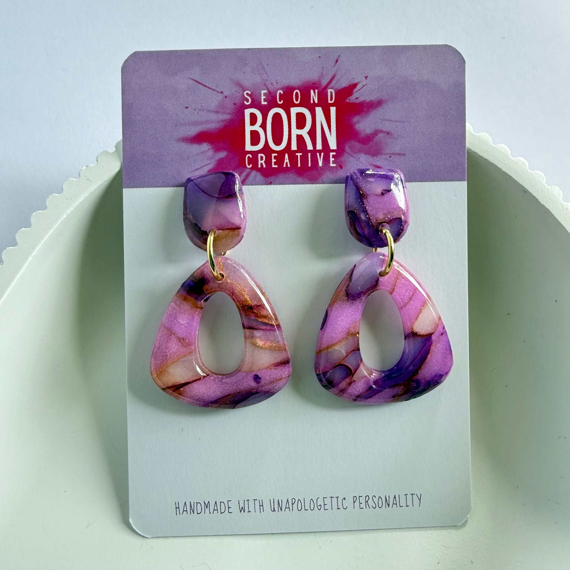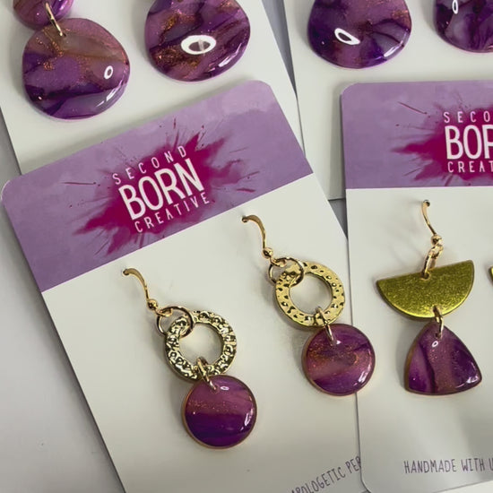 These earrings are large sized with stainless steel gold hooks and findings. They are made from lightweight polymer clay with a durable resin finish to make the vibrant colours and shimmery gold POP!